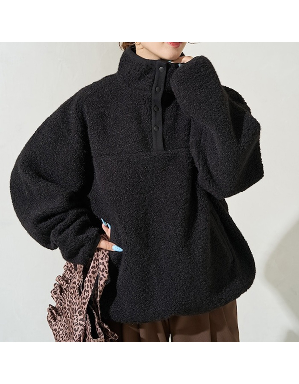 FREAKS STORE WOMEN MARSHMALLOW BOA SNAP BUTTON PULLOVER BLACK